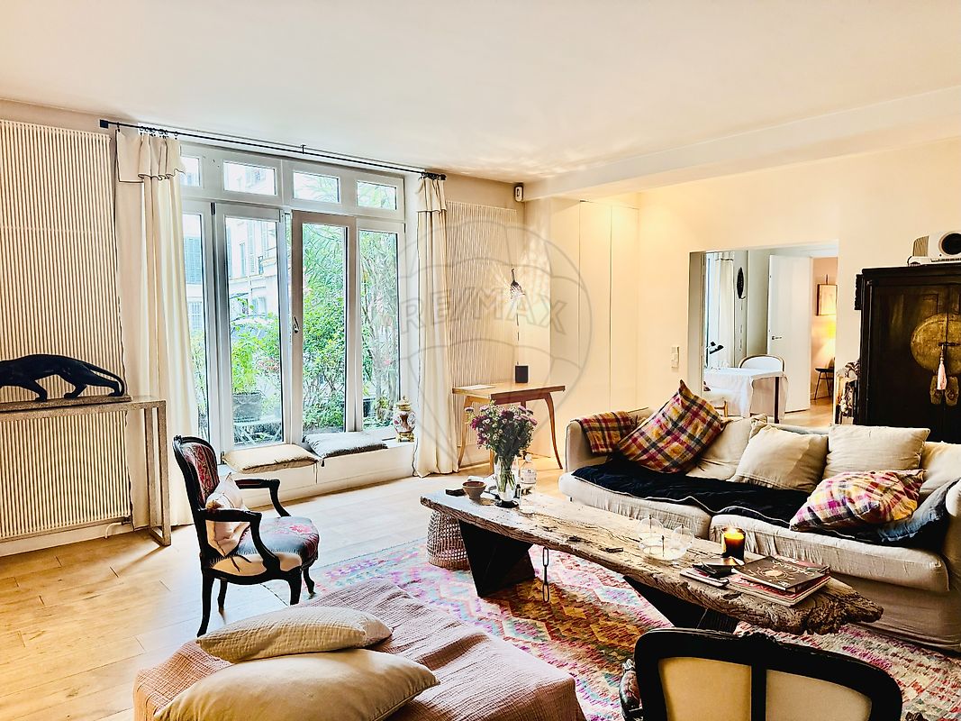 Rue Saint Lazare, proche du Métro Trinité-D’Estienne d’Orves, « COMME UNE MAISON A LA CAMPAGNE », dans un bel immeuble ancien, appartement en très bon état de 121m2 donnant sur une jolie cour pavée orientée sud, comprenant une entrée, une cuisine aménagée équipée avec un coin repas, un dégagement avec de nombreux rangements, un vaste séjour de 42m2 avec une cheminée, une buanderie, une salle d’eau avec des wc, une chambre/bureau, une suite parentale avec une salle de bains, des wc séparés et un dressing. Chauffage et eau chaude au gaz. Belle hauteur sous plafond. Une grande cave en sous sol complète ce bien. Possibilité de louer une place de parking dans la cour auprès de la copropriété. Profession libérale autorisée, 2 entrées possibles.